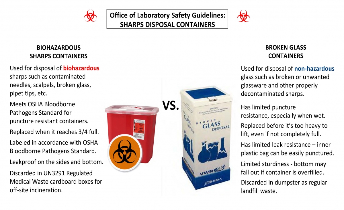 Sharps are instruments that can puncture, cut, or scrape body parts. These include, but are not limited to syringes, needles, scalpel blades, razor blades, wires, Pasteur pipettes, lancets, and other sharp metal laboratory waste. Sharps are puncture hazards to laboratory staff and waste handlers. For this reason, it is recommended that PIs use safety engineered sharps whenever possible to reduce the risk of exposure to potentially infectious materials or hazardous chemicals.